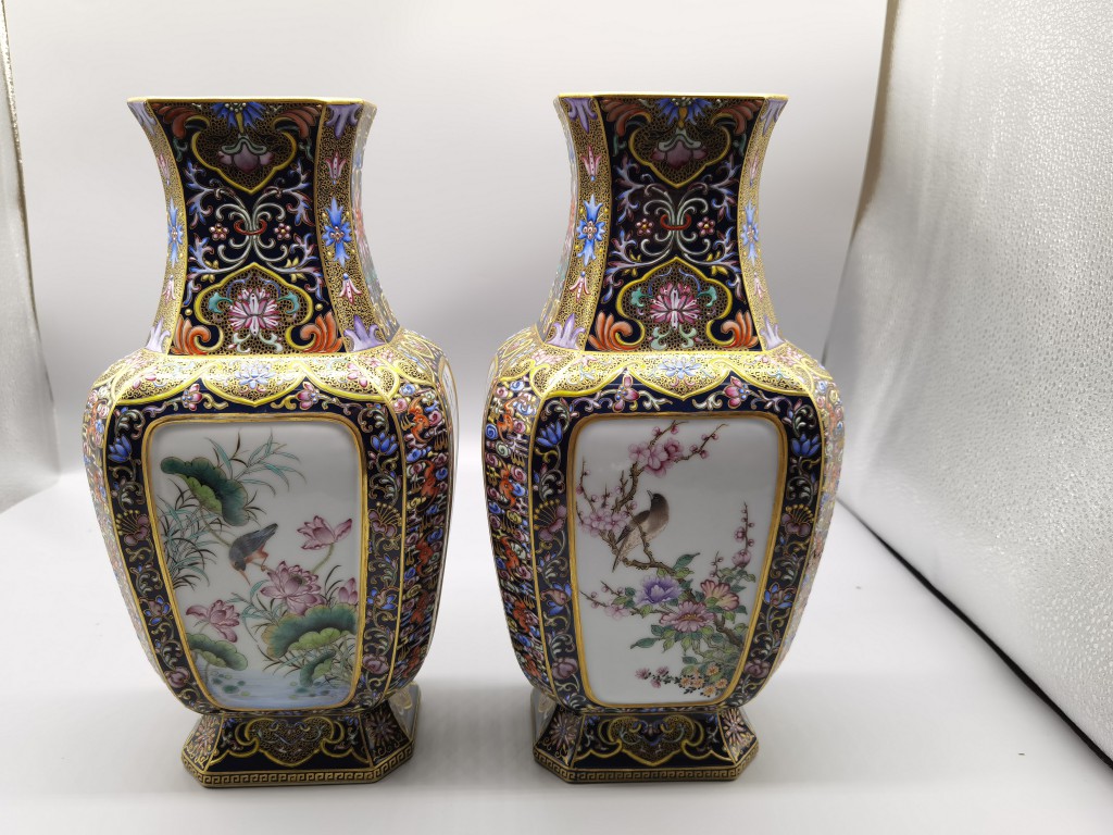 • (清乾隆) 磁胎洋彩青地金花魚遊轉心瓶(清乾隆) 磁胎洋彩青地金花魚遊轉心瓶
